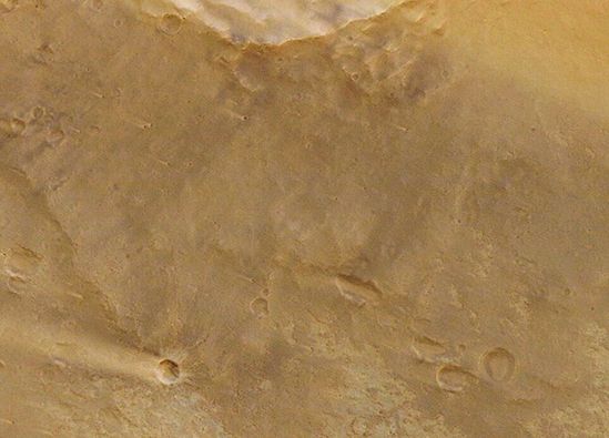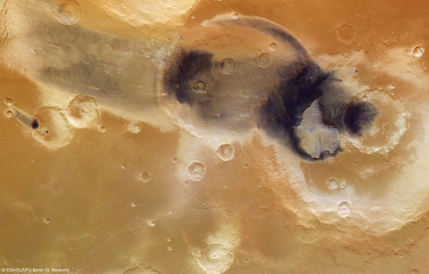 ESAのMars Express火星探査衛星が撮影したBecquerelクレータの画像です。クレータ内の水が気候変動で蒸発した後に堆積した地層が強風で吹き飛ばされ跡のようです。 |