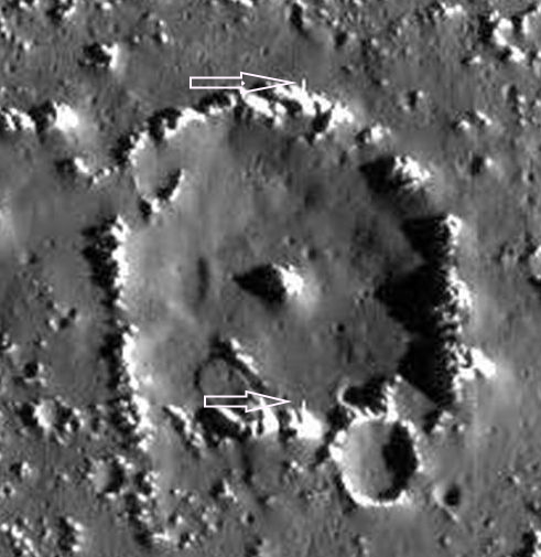 カリストは木星の衛星で直径4800kmと太陽系で3番目に大きな衛星です。左側のクレーターを拡大した画像の上端と下端の淵にアンテナが立っているので分かります。矢印先のアンテナには影があるのが分かります。 位置:17.5° N 142.1° W Source:NASA/JPL/DLR PIA03456: Global Callisto in Color http://photojournal.jpl.nasa.gov/jpeg/PIA03456.jpg Source:NASA/JPL PIA01631: So few Small Craters on Callisto http://photojournal.jpl.nasa.gov/jpeg/PIA01631.jpg |