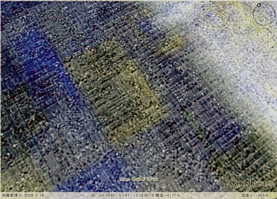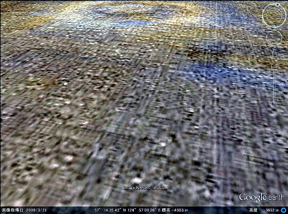 工場のような構造物が密集している地域です。住居跡かも知れませんが、火星の多くの地域で見られます。構造物の形状は多種ですが、東西南北に正確に並んでいます。 |