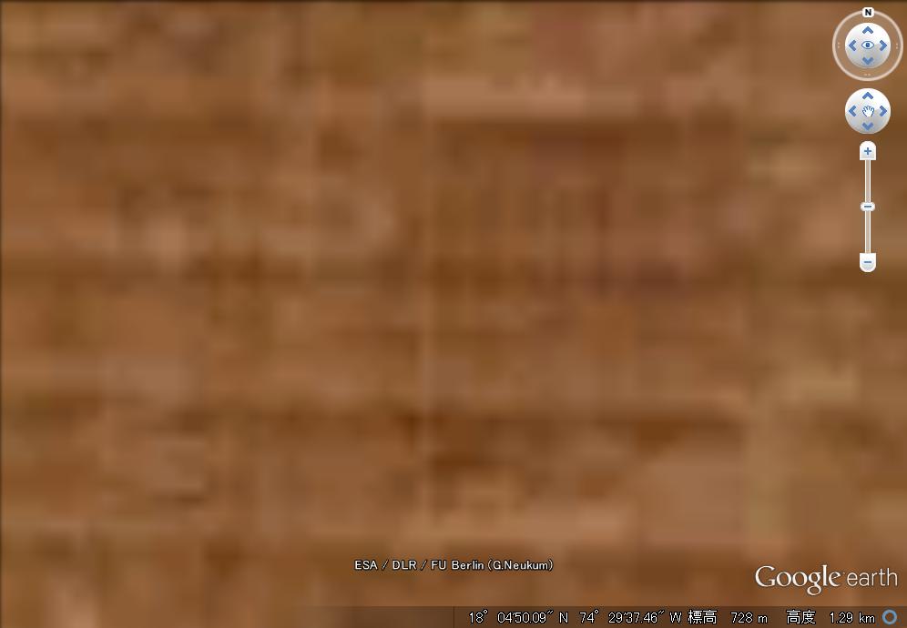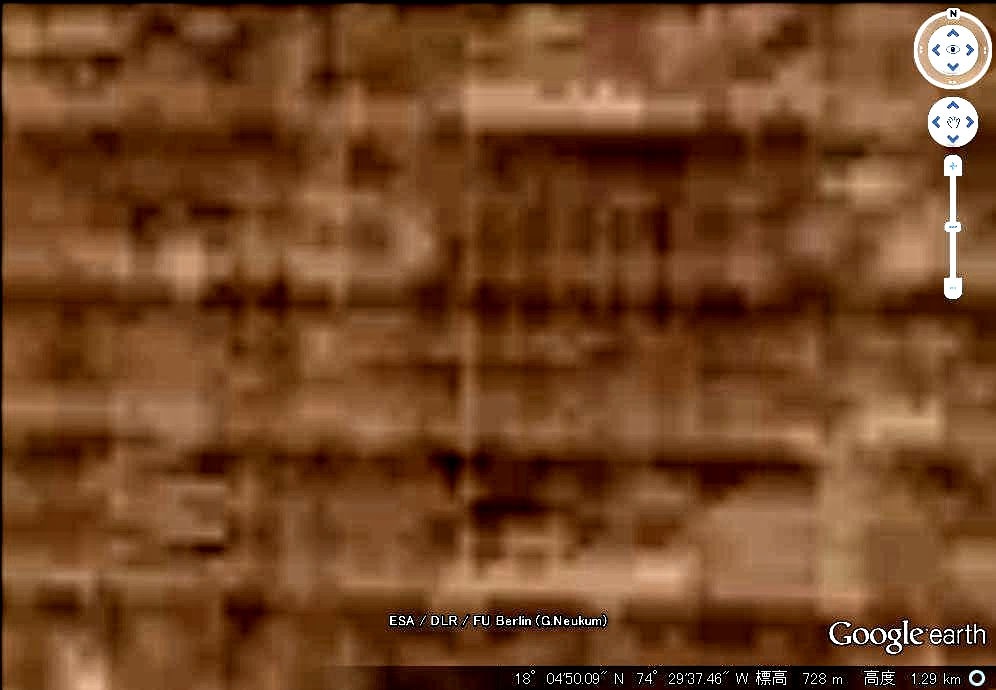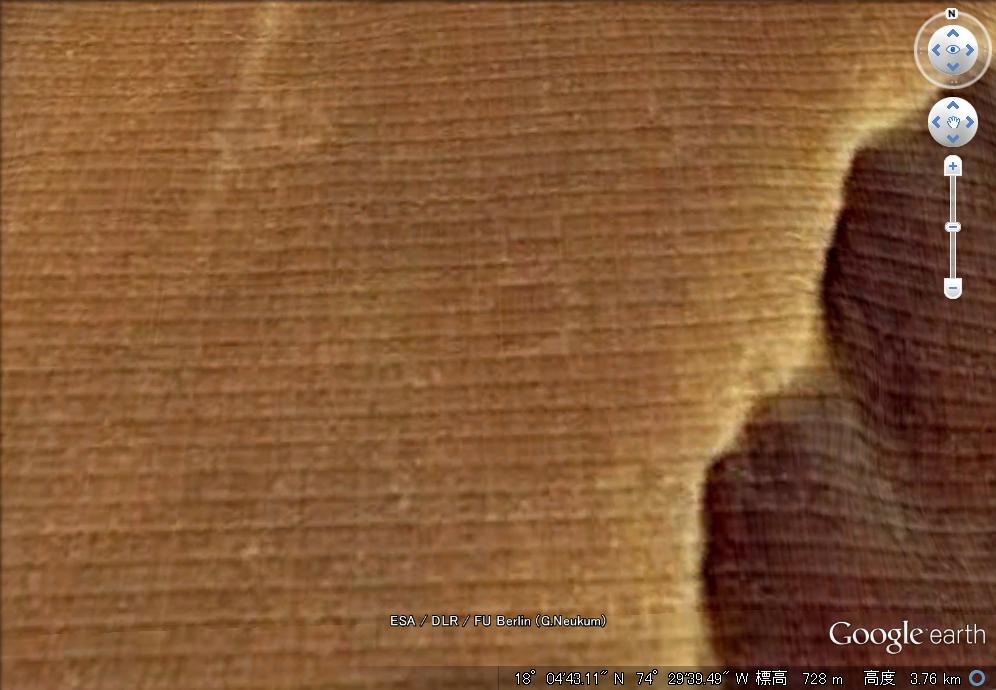 洪水で削り取られたと思われる数千m級の台地の上に網の目状に構造物が等間隔に並んでいます。ラインとラインの幅は約90mになります。 |