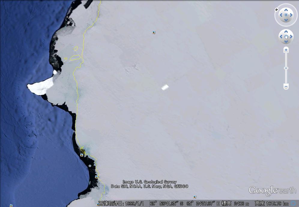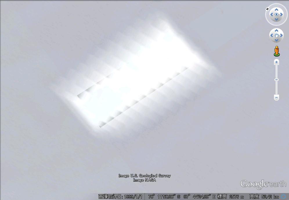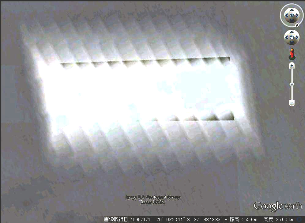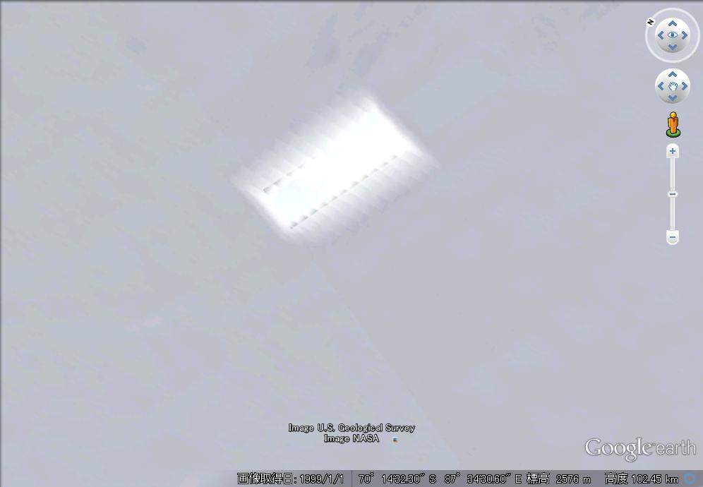 左は1000km上空からの眺めで、白く輝く長方形の構造物が見えます。 |
