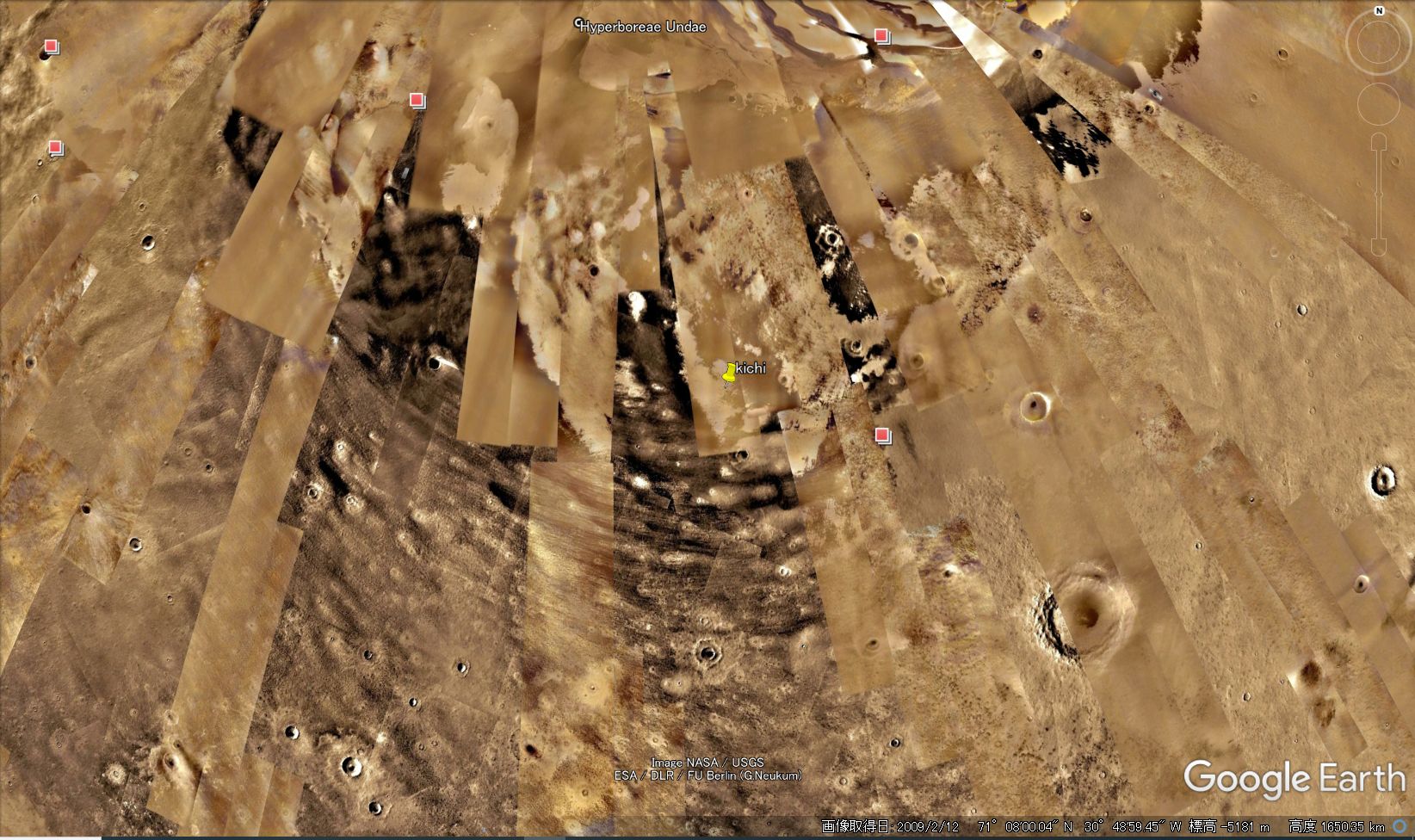 グーグル火星上の構造物です。高度が1650kmなので全く見えませんが画面の中央に位置しています。 |