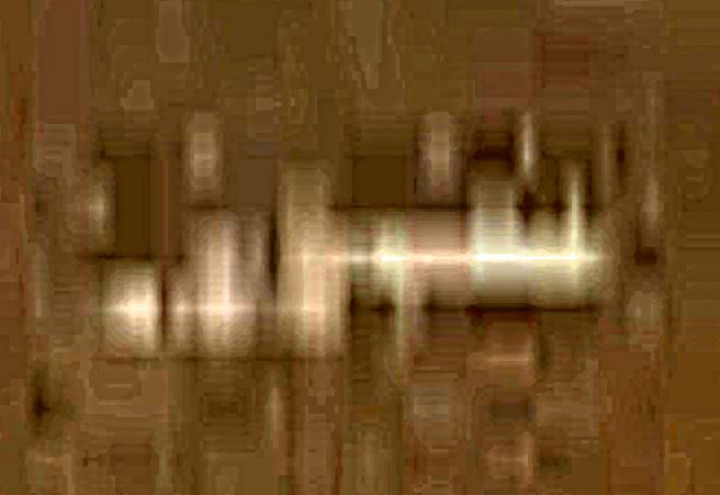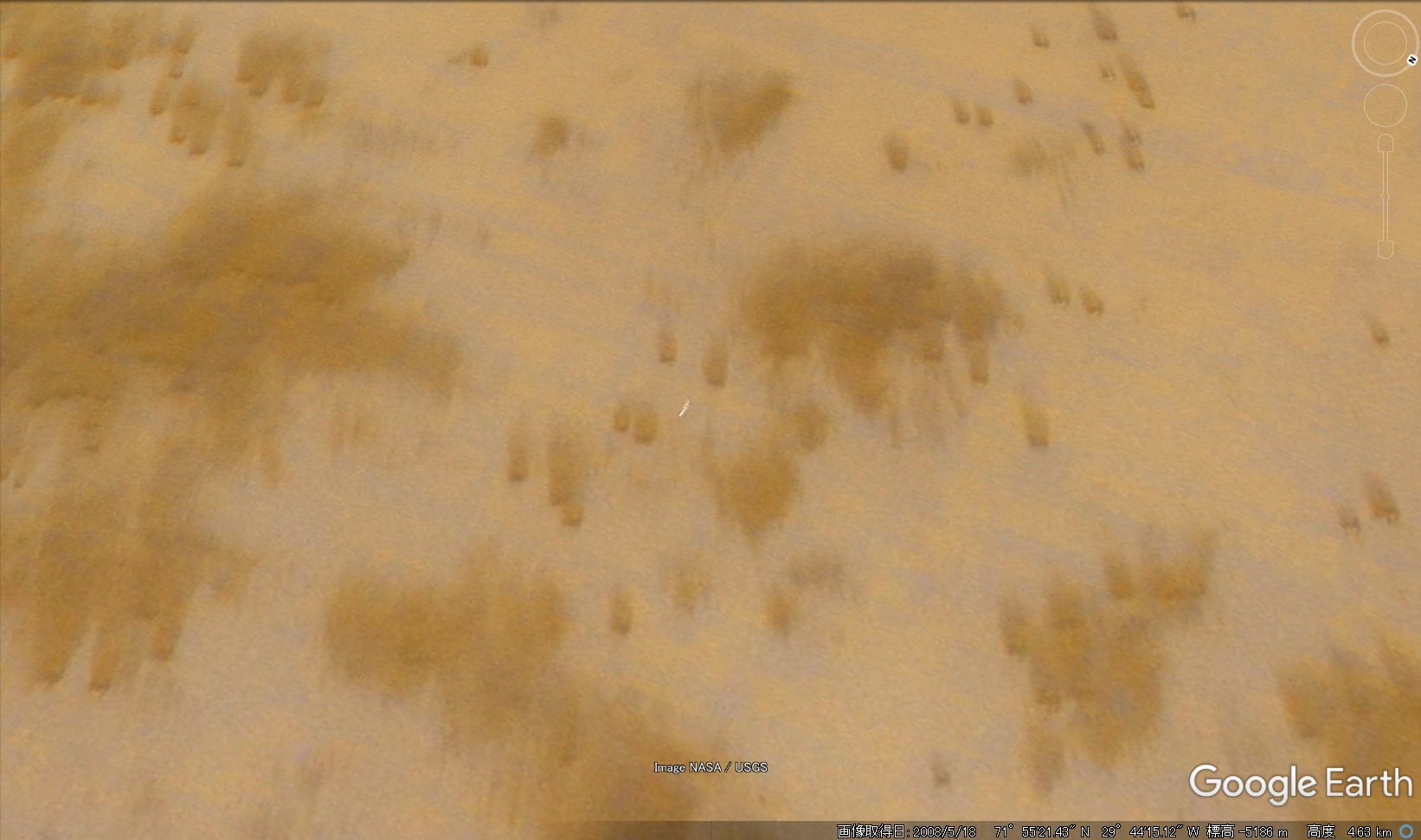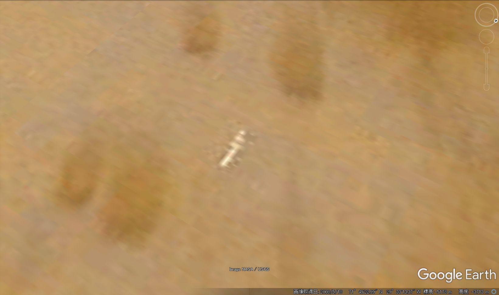 このタンクのような構造物は金色、ピンク色、銅色の三色で交互にストライプが入っており、光輝いているので金属性で間違いないように思えます。 この構造物の横(画像では下側)には三角形の盛り上がりがあります。上側には円柱の軸になるような突起があるので、この構造物は巨大でありながら固定されているのではなく上下に動く、或いは移動できるようになっているのではないでしょうか。 Image NASA/USGS 71°49'22.05″N 29°32'54.70" W 同じ画像を確認希望であればgoogle earthの火星を起動して左上の検索の窓に上記の値をコピー・ペーストし検索を実行して下さい。 |
