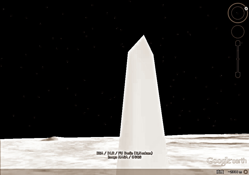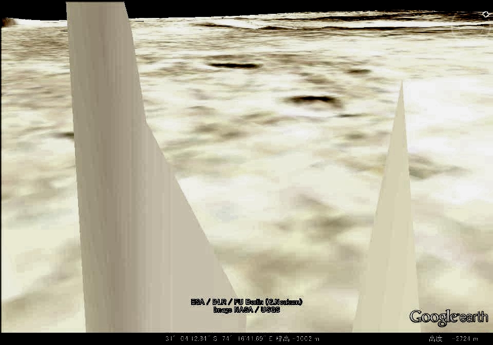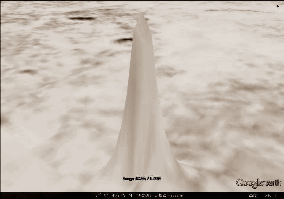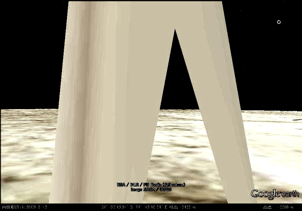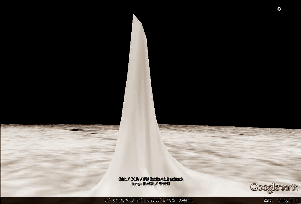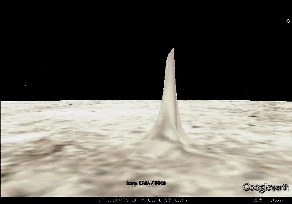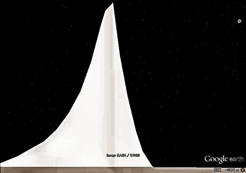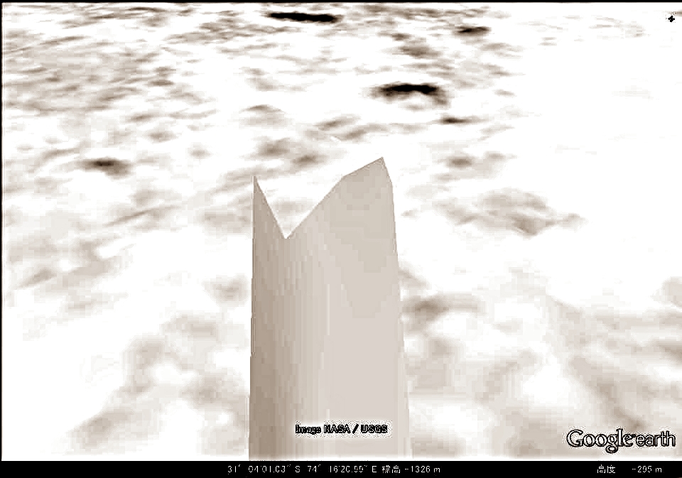 火星の表面で不自然に凍っているように見える地域に人工物と思われる超高層の塔があります。地表の色が白いのはこの塔の存在を隠す為なのでしょうか。 |
