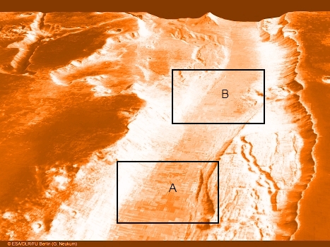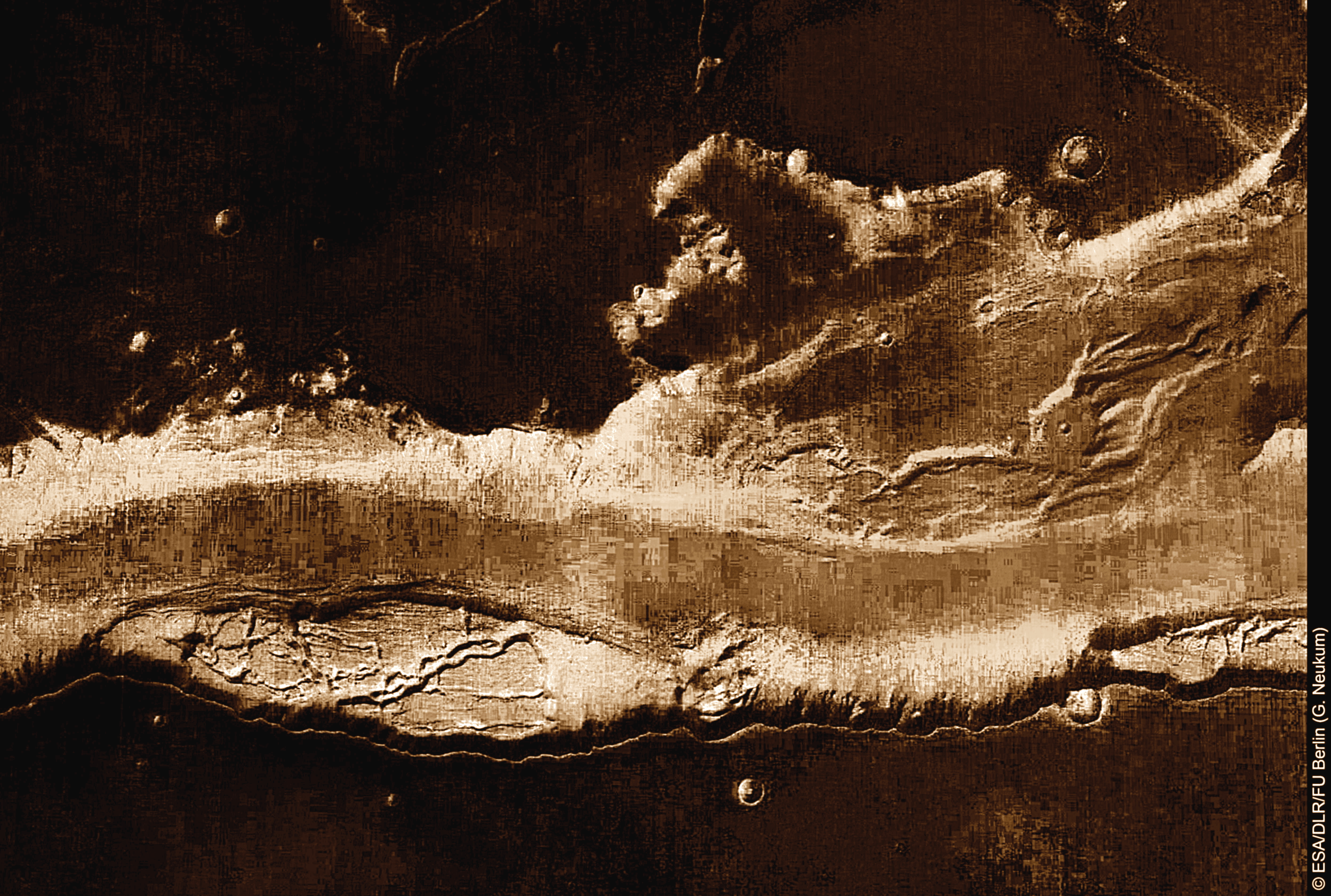 【解析拡大画像E】 上の【解析拡大画像D】の地区を含むKasei Vallesの地域をMars Expressが別の角度、真上上空、から写した映像の解析画像です。谷の幅は10kmから15km、深さは1kmから2kmになります。 http://sci.esa.int/science-e-media/img/f4/KaseiValles -SouthBranch.jpg Image Resolution: 29 m per pixel View: Overhead Copyright: ESA/DLR/FU Berlin (G. Neukum) 【Mars Longitude 293° E / Latitude 23° N 】 『画像が大きいのでスクロールして全体が見えるようにしています。右側と下側のスクロールバーをスライドして見て下さい。』 |