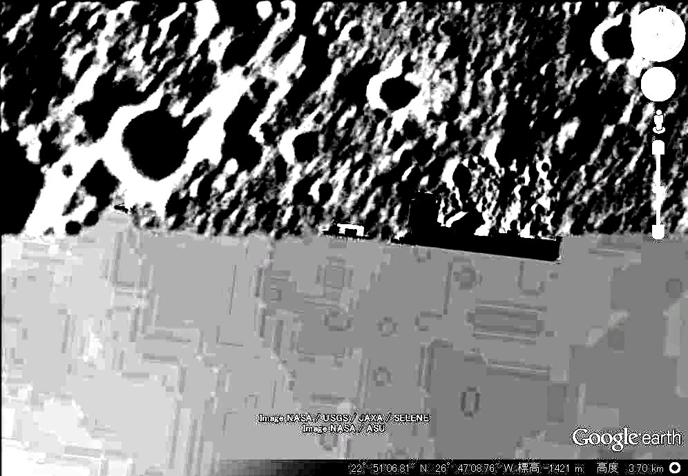 (A)の画像を強調表示したものですが、下半分にも広い範囲で開口部と構造物があるのが分かります。