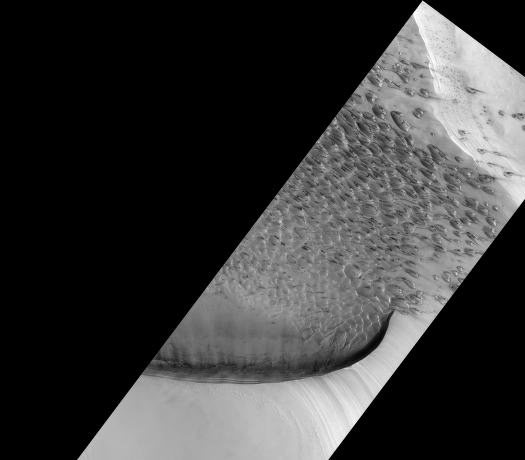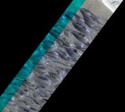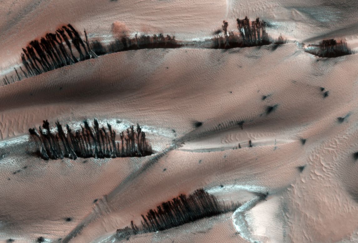NASAの公開した火星の砂漠が詳細に映った映像です。アリゾナ大学の説明では樹木は砂面上に出来きた模様で、偶々樹木に見える見解です、しかし砂丘に針葉樹のような樹木が生え、風紋が砂漠にできているように見えますが。樹木の頭上の砂がにじんだような色になっていますがこれは模様に見せるための修整では。 Source:NASA/JPL/Universisty of ArizonaMRO HiRiSE: PSP_007962_2635 https://hirise.lpl.arizona.edu/PSP_007962_2635 【 Mars Longitude:83.5° Latitude:118.6°】 |