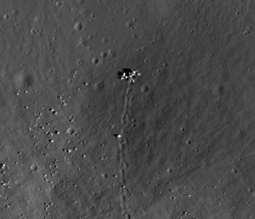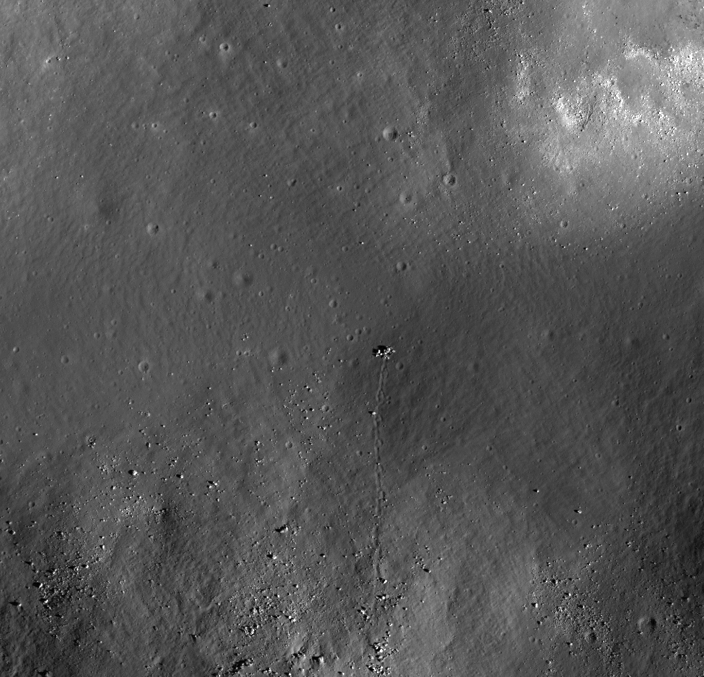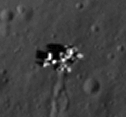 物体から溝のような跡がついているので移動していると思われます。物体の大きさは25.2m X 16.8mとこれまでに月面に着陸したルナ、アポロ、サーベイヤなどの探査機や着陸船よりかなり大きな構造物です。因みにアポロの着陸船の直径は4.3mです。 |