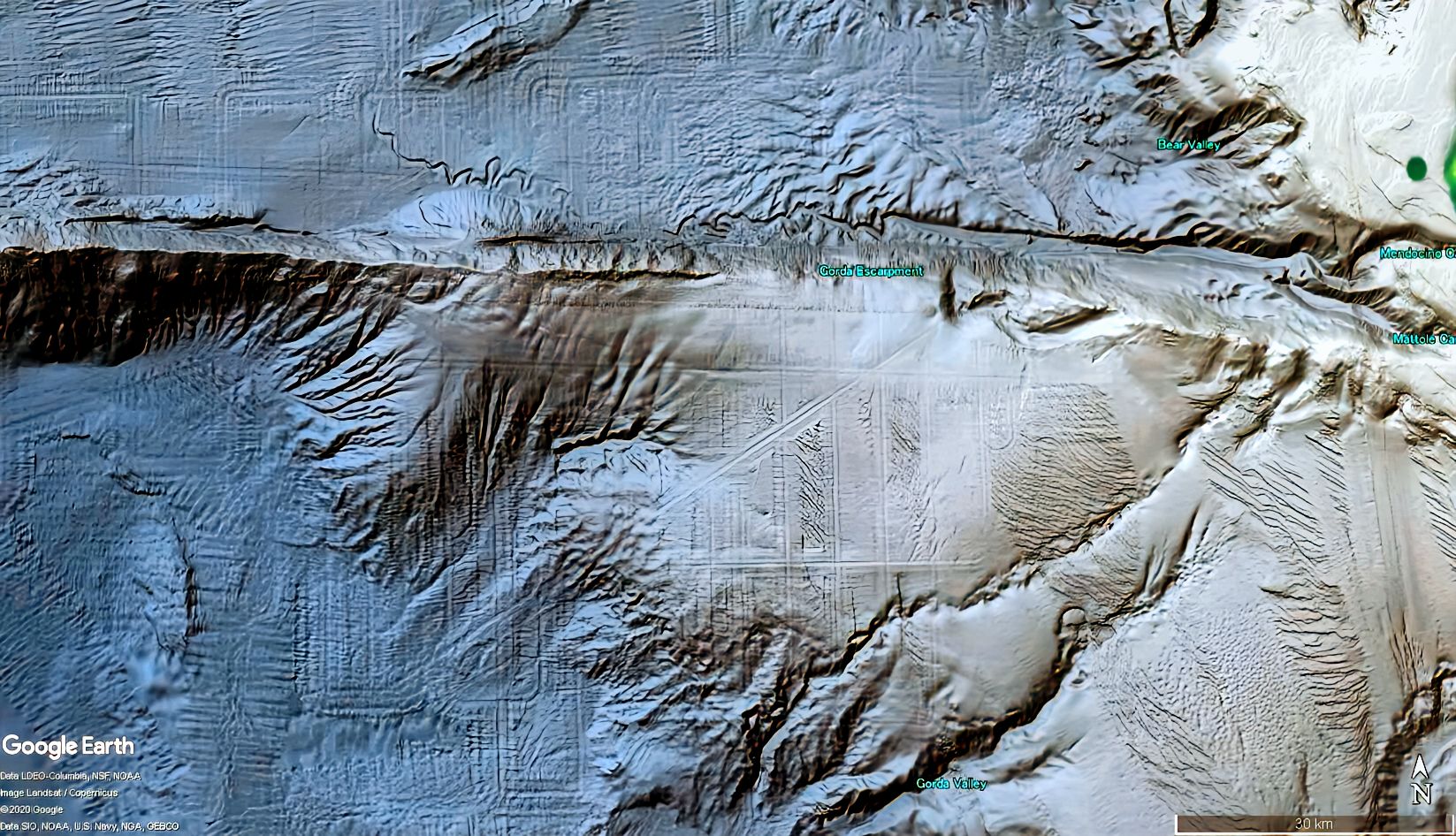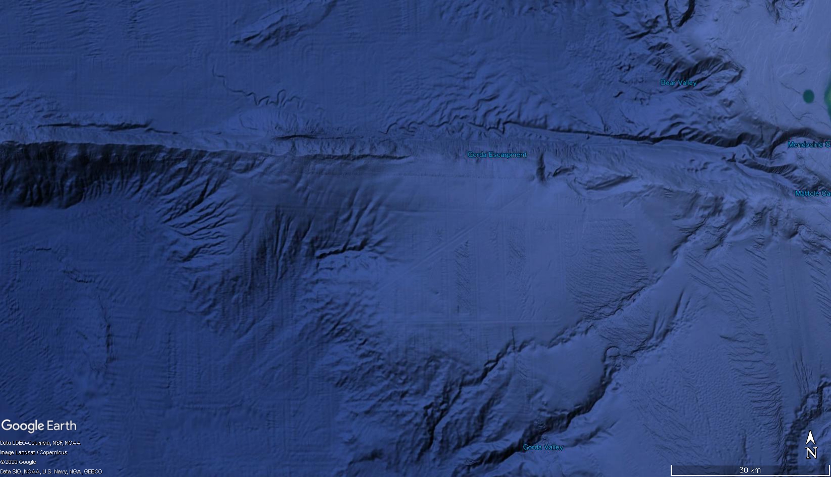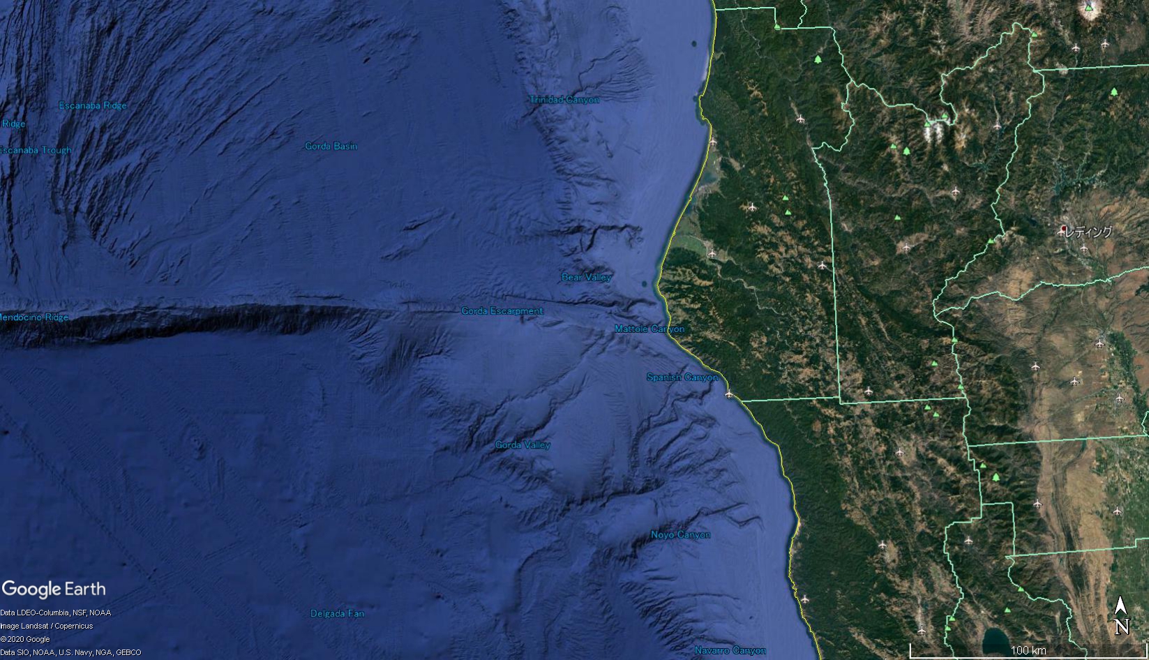 上と同じ地域を東側から見た景色です。手前の直角三角形の都市跡と思われる地域は海面下1500m位、崖の右側の地域は海面下3000m位、崖の左側奥の濃い灰色の地域は海面下3500m位になります。 エベレストが隆起した地殻変動と同じ速度で沈下したとすれば2000万年以上前に陸地だった時の都市跡になります。 従って現在のホモサピエンスと異なる人類等がその当時に存在していたことになります。 詳細を見ることができるように大きな画像サイズにしています。画面上のプラスとマイナスのボタンで拡大縮小して観察して下さい。 I2020 Google Image Landsat/copernicus Data LDEO-Columba, NSF, NOAA Data, SIO, NOAA, US, Navy NGA GEBCO 40°10' 21 26" N 125°12' 20 00" W |