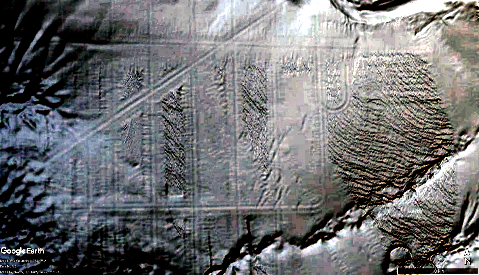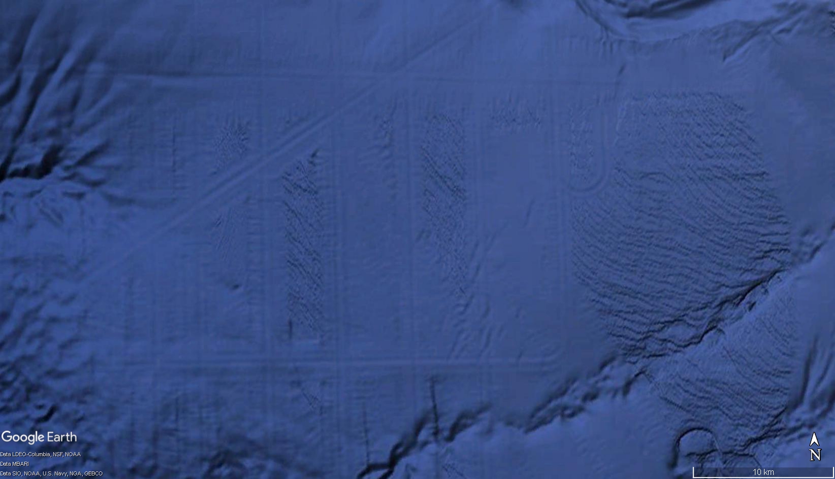 画面左上のミミズのように蛇行している溝は川の流れの跡のようなので、この地域がかって陸地だったこと示しています。また中央の2等辺三角形の斜めの線はまだその先があり延長すると更に都市跡とみられるパターンがあり、画面全体の半分以上が都市跡とみられほぼ東京都と同じ面積になります。川跡と見られる地域は海面下3000m位で三角形の地域は海面下1500m位、斜め線の延長先のエリアは3500m位の深さになります。 グアム沖の海底の構造物がある地域は海面下3000m位なので同時期に存在した文明跡ではないでしょうか。 詳細を見ることができるように大きな画像サイズにしています。画面上のプラスとマイナスのボタンで拡大縮小して観察して下さい。 I2020 Google Image Landsat/copernicus Data LDEO-Columba, NSF, NOAA Data, SIO, NOAA, US, Navy NGA GEBCO 40°10' 21 26" N 125°12' 20 00" W |